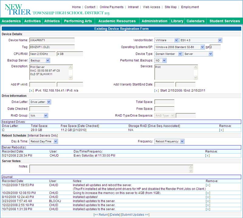 | | - | Device Management (Servers/Network Devices) | | | o | This was developed for asset tracking, it also allows us to schedule unattended server reboots |
